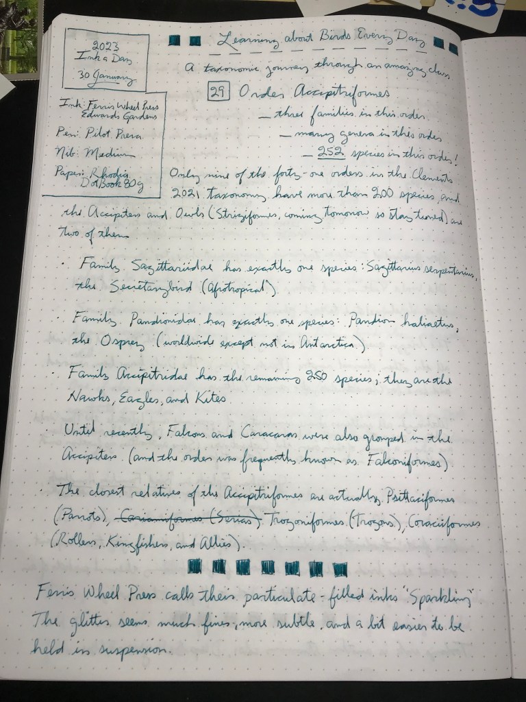 The particulate in Ferris Wheel Press’s “sparkling” ink seems much finer than the glitter in the Diamine Inkvent shimmering inks, resulting in a much more subtle glitter. To be honest, I spent some time shaking the pen to keep the glitter in solution, but not a ton. Accipiters include over 200 species of Hawks, Eagles, and Kites, plus the Secretarybird and the Osprey!