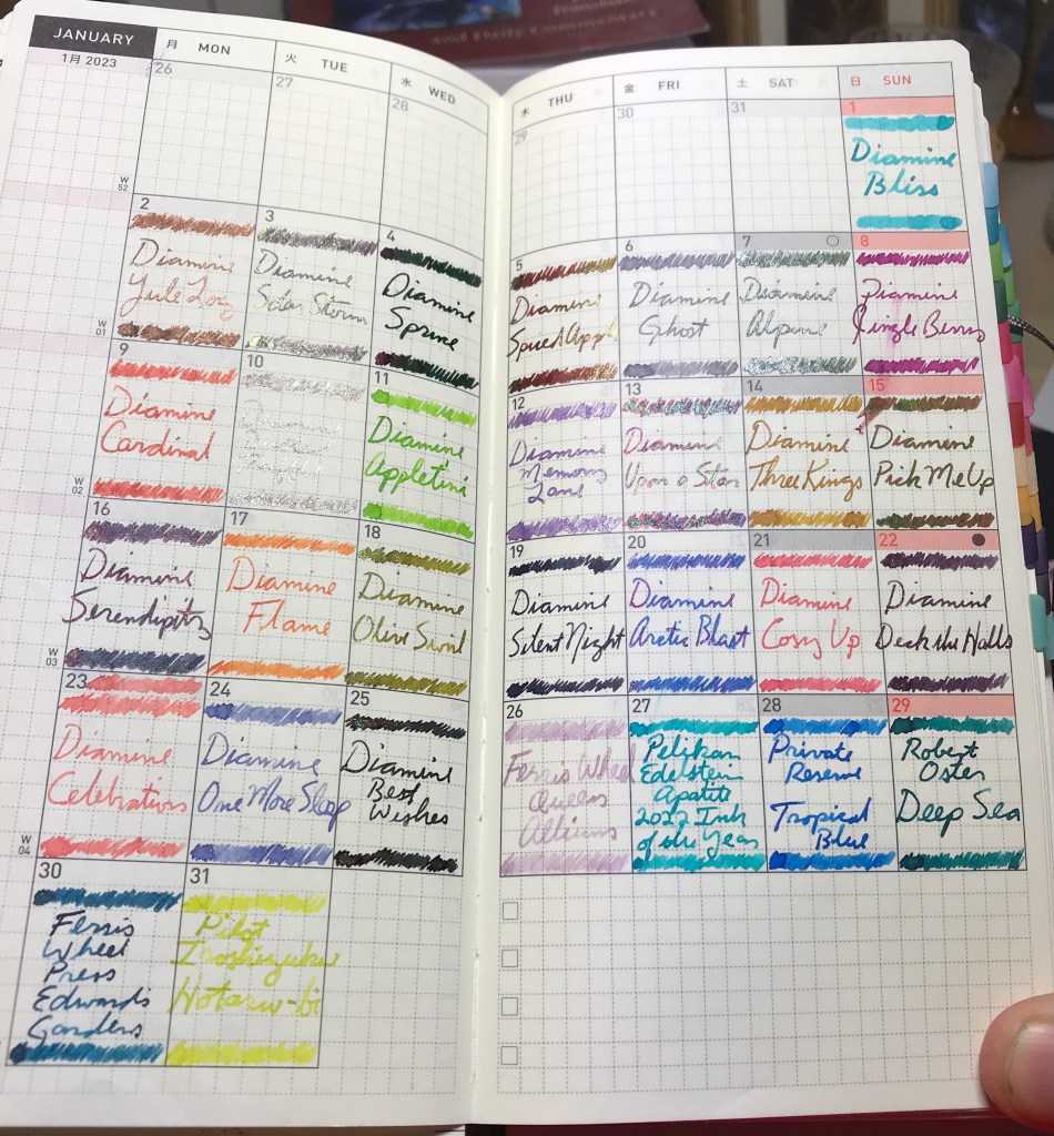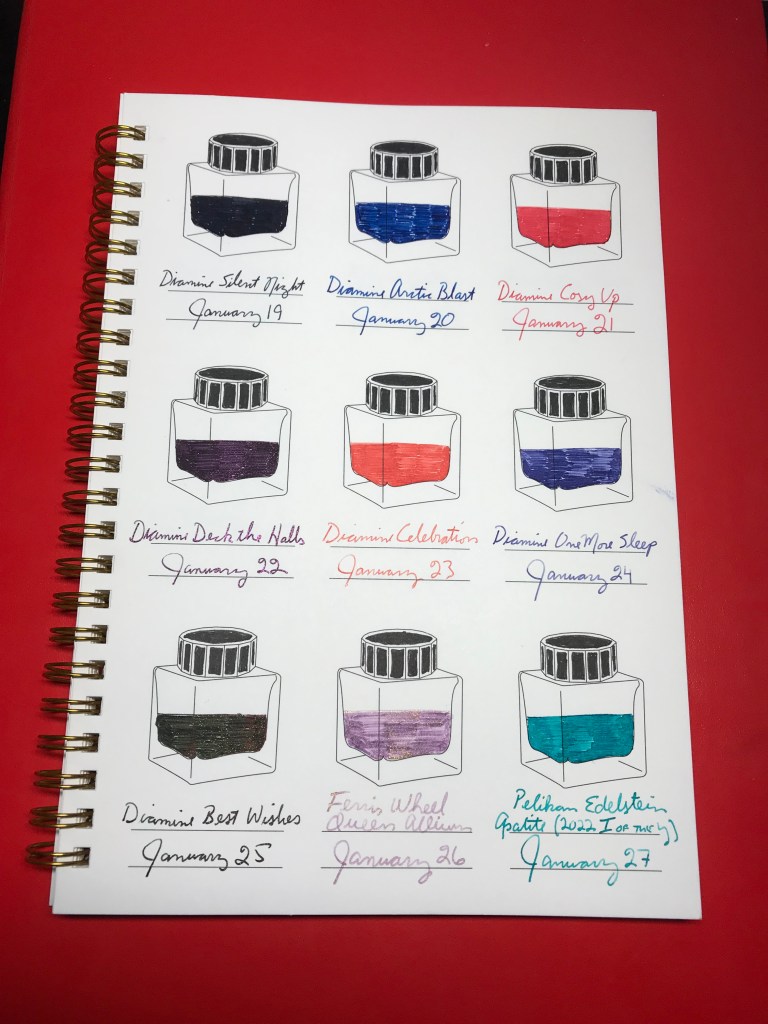 25 out of our 31 January inks came from Diamine’s 2022 Inkvent Calendar. If you’ve been following along, you know that I’ve struggled with loving shimmering inks while simultaneously not enjoying their high maintenance qualities. But I truly enjoyed writing with each of this month’s inks. And so, from worst to first, here are my rankings (with some photos of the inks as a reminder):