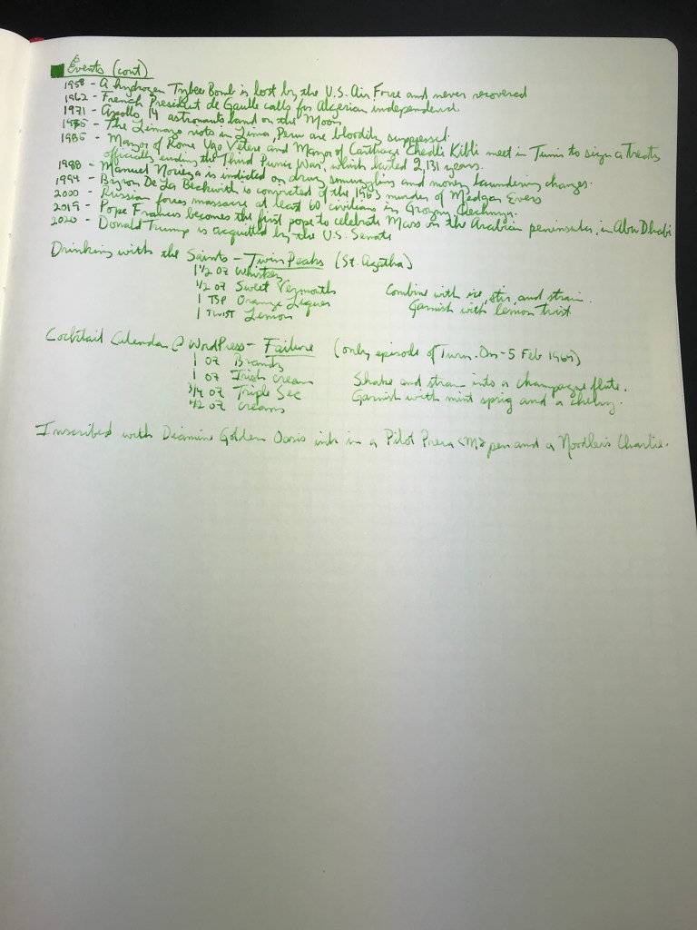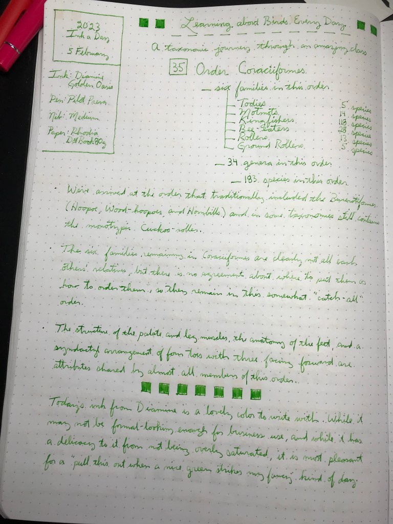 Well, I did most of today’s writing with this ink without realizing it is a shimmering ink. Only towards the end (when I had switched from my fairly regular Pilot Prera to using a Noodler’s Charlie as a dip pen) did I see the shimmer in the ink vial. So take a look at the thumbnail and the closeup to get a sense of how this ink SHOULD’VE looked the whole time. You’re probably familiar with the Belted Kingfisher in our part of North America, but today’s order also includes birds called Todies and Motmots (!). Enjoy!