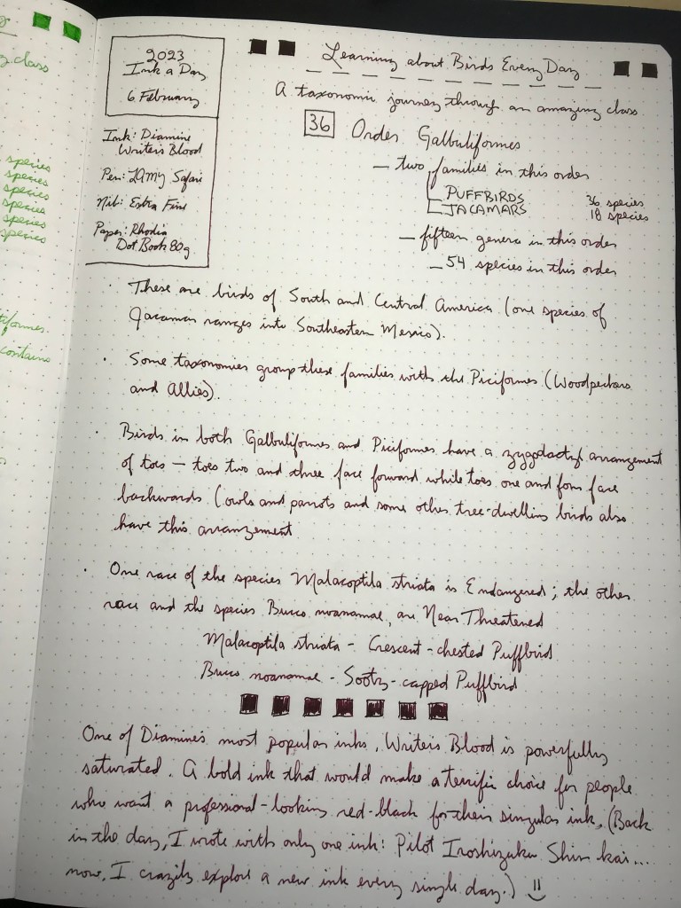 Writer’s Blood is one of Diamine’s consistently most popular inks, and for good reason. It’s a bold, professional-looking red-black – super-saturated and handsome. Puffbirds and Jacamars for your birding pleasure today. Enjoy!