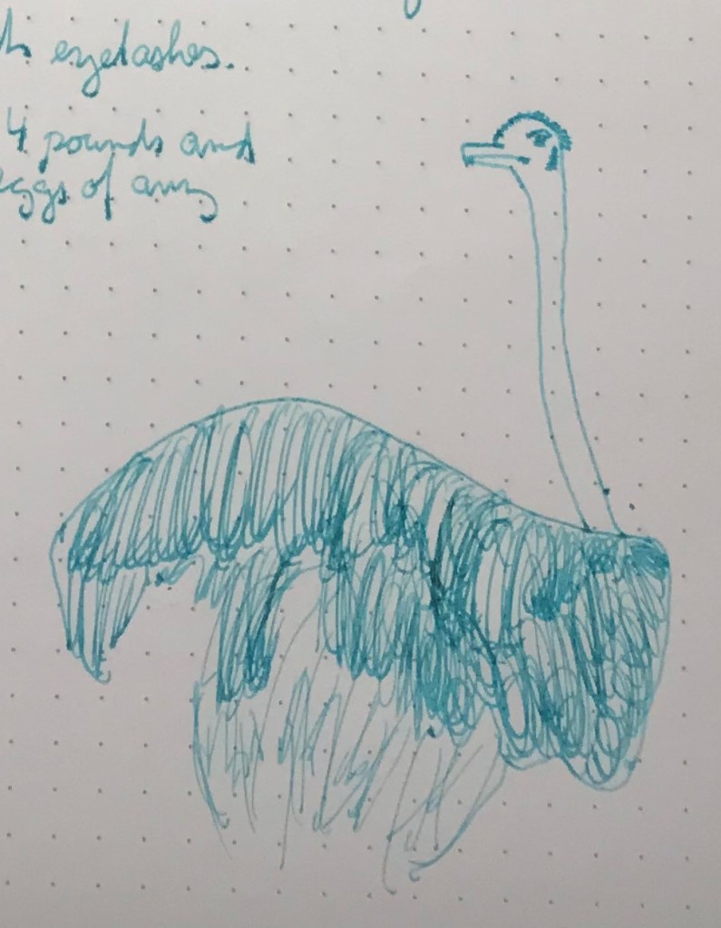 Well, the exploration of all the birds by Families has begun, so we’re back to the Ostriches (Struthionidae) and now, on top of my seriously deficient cursive, you’ll be treated to my childish illustration skills! Enjoy learning some fabulous facts about the world’s biggest birds while taking in the soothing, happy Blue Nose Bear from Noodler’s!