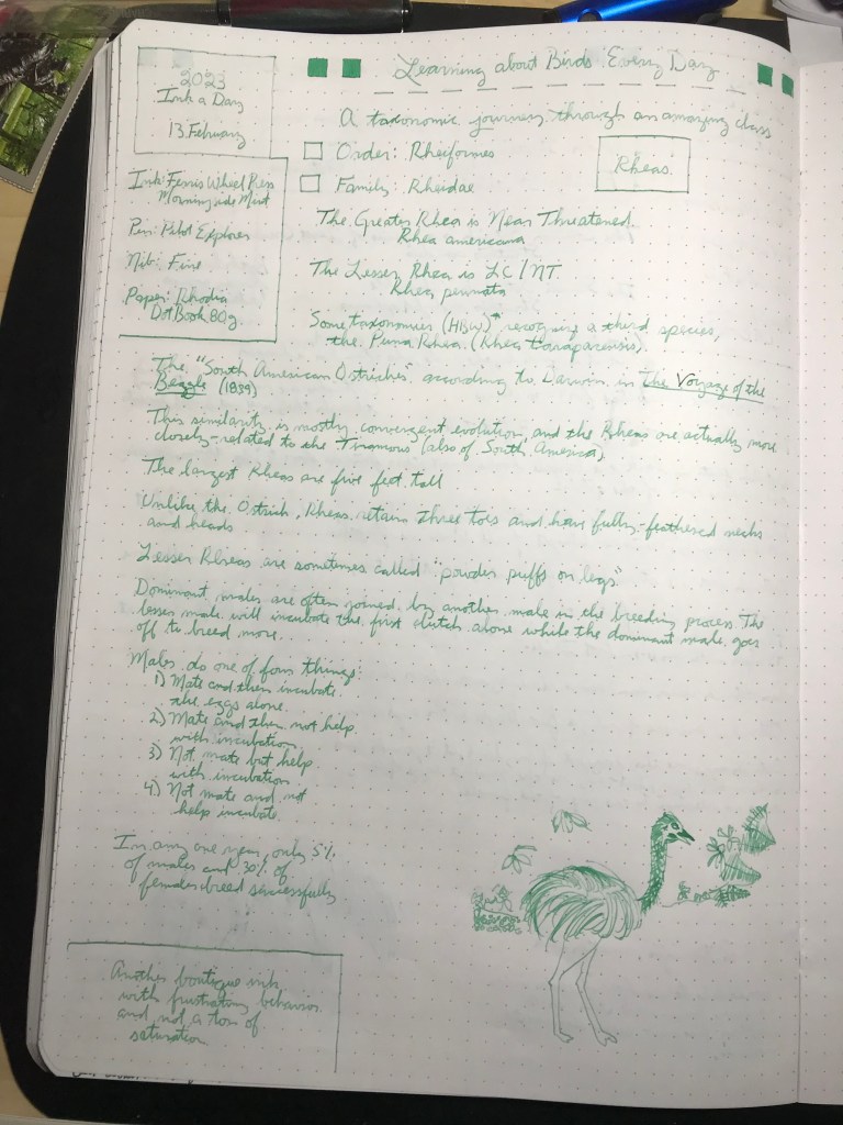 Another disappointing, boutique ink that isn’t saturated enough and is a challenge to write with. (Though I still hold open the possibility that with a Medium or Broad nib the flow might be better, or that somehow glitter is to blame, but I really don’t think it’s the glitter at this point, because other inks do just fine in the same pens.) Also, enjoy the birds Darwin called the “South American Ostriches”: RHEAS!