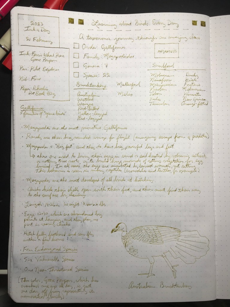 I admit it, today’s ink has had me laughing hysterically all day. It’s a beautiful ink, and if someone didn’t know the name of the ink, they’d think only “this is a beautiful ink”. But the name creates this super-odd juxtaposition in one’s mind: see the beautiful ink and at the same time think “yep, of all the shades present in goose poop, this is certainly an evocative one!”. And… it was only one day off from our coverage of the family that includes geese! But you still get the remarkably odd Megapodes to learn about through this “amazing” color 🙂