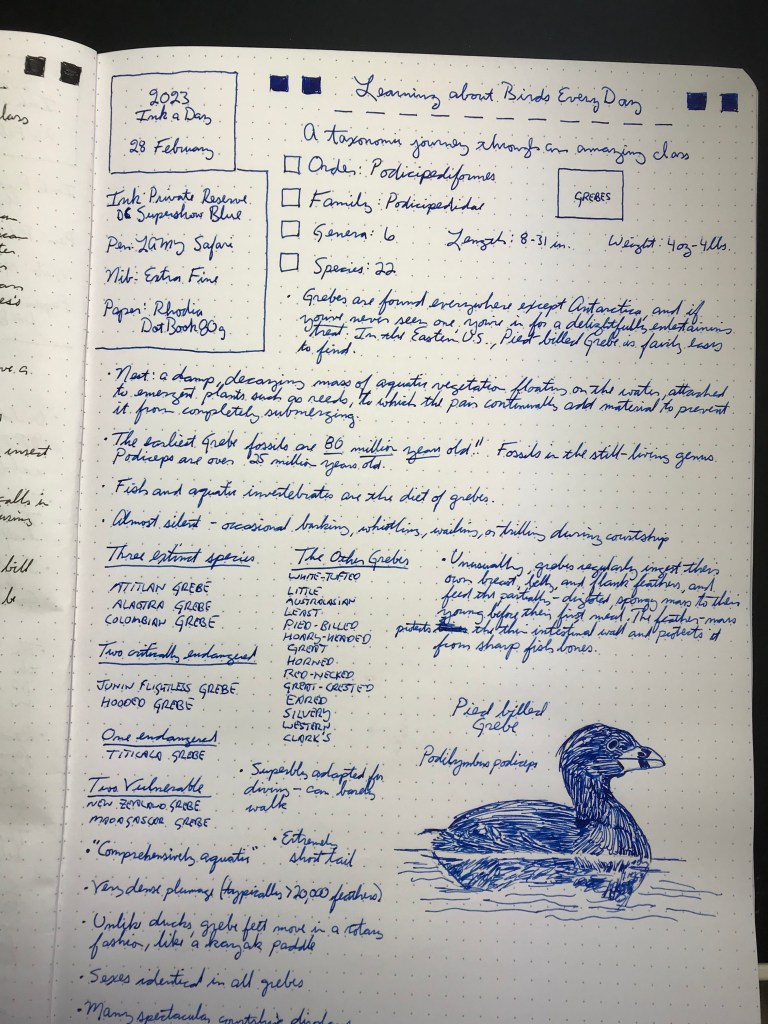 So… there are these things called Pen Shows. There’s a pen show calendar. These shows fill hotel ballrooms for an entire weekend. But once a year, there’s a Pen Supershow, and it’s just outside Washington, D.C. It’s so super that companies often make pens or ink just for the show. Here’s one, and while you enjoy it, learn about the aquatic miracles (and total land-failures) that are the Grebes.