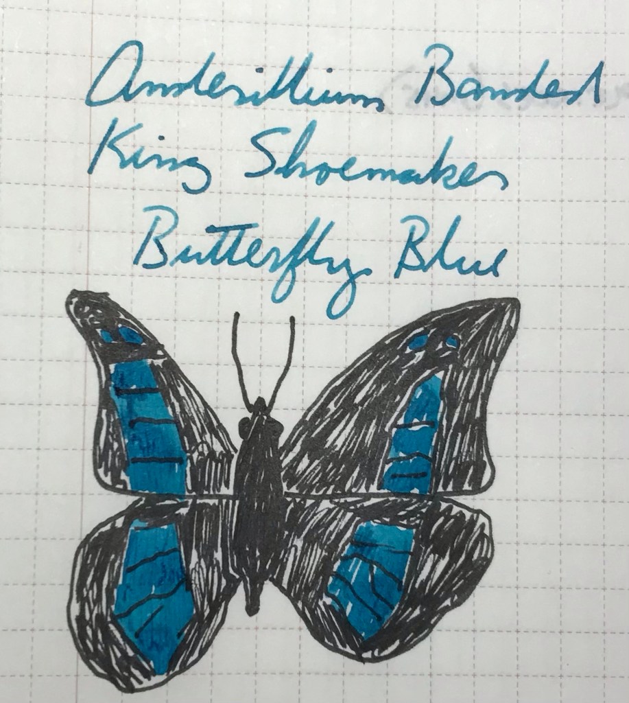 Not the male has any blue, and that limited to a shocking strip on each wing segment of an otherwise jet black butterfly of the tropical montaine forests. The ink is leaning towards turquoise, which is just fine by me.