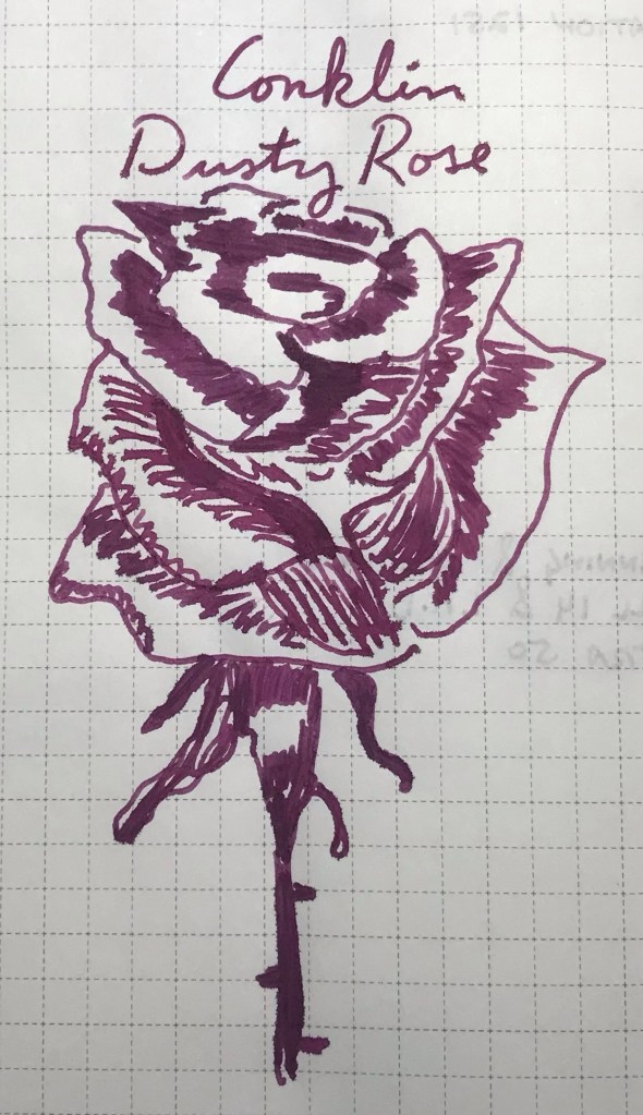 The newest addition to my small (by comparison to, say, my Diamine collection) Conklin bottles, Dusty Rose surprised me as a pleasant shade. The saturation, depth, and subtlety of this color seems spot on.