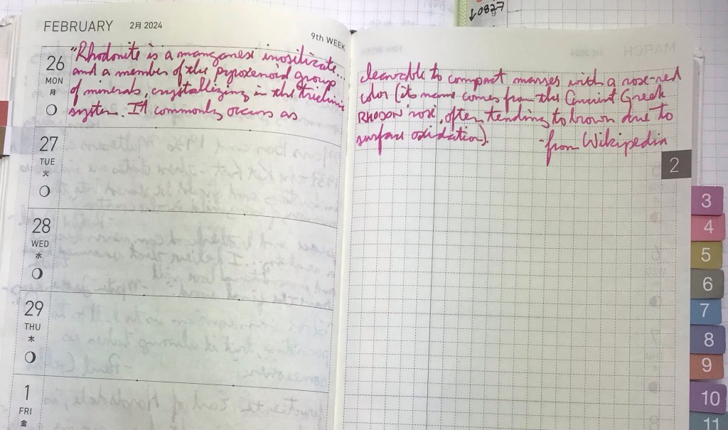 LAMH inks are economical, relatively speaking, and the “pricier” crystal line are still very affordable. And this Rhodonite is an absolute stunner. I’m surprised how many inks are named for gems and elements, so I learned a little about Rhodonite today (always thrilled to learn new things).