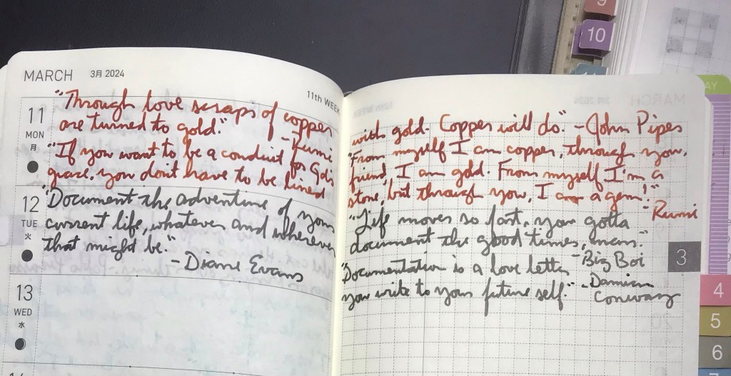 “Document the adventure of your current life, whatever and wherever that might be.” -Diane Evans. “Life moves so fast, you gotta document the good times, man.“ -Big Boi. “Documentation is a love letter you write to your future self.” -Damian Conway.