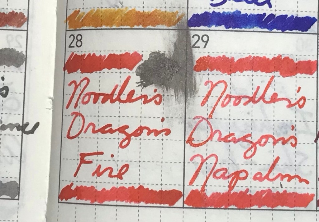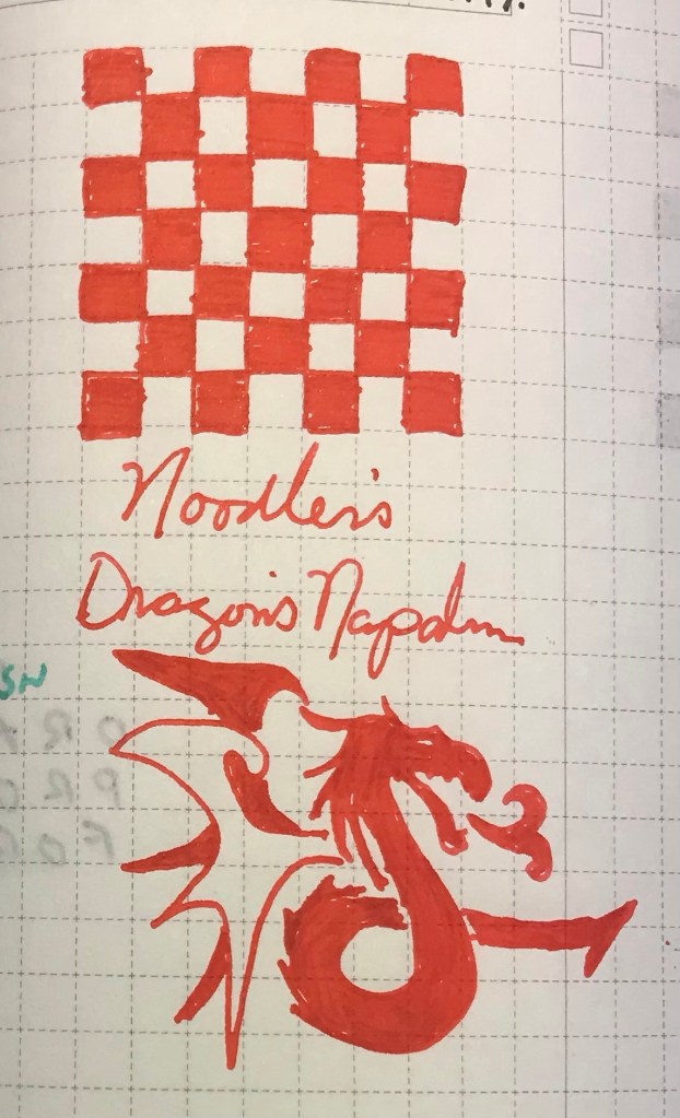 Noodler’s Dragon’s Napalm“Here be dragons to be slain, here be rich rewards to gain – if we perish in the seeking, why how small a thing is death.” -Dorothy L. Sayers. “He who fights too long against dragons becomes a dragon himself, and if you gaze too long into the abyss, the abyss will gaze into you.” -Friedrich NietzscheAlmost a D&D dragon!