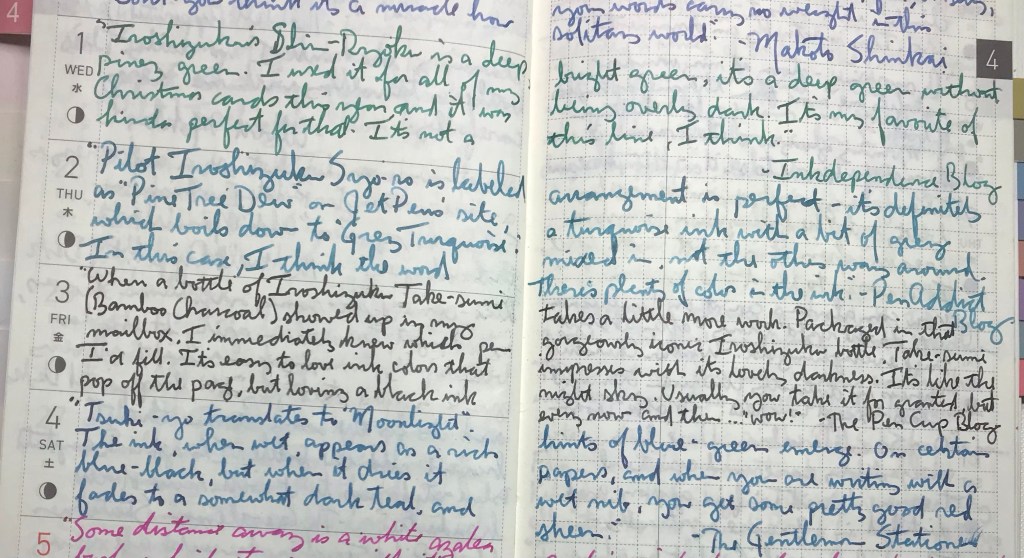 Pilot Iroshizuku Tsuki-yoMoonlight“Tsuki-yo translates to ‘Moonlight’. The ink, when wet, appears as a rich blue-black, it when it dries it fades to a somewhat dark teal, and hints of blue-green emerge. On certain paper, be when you re writing with a wet nib, you get some pretty good red sheen.” -The Gentleman Stationer