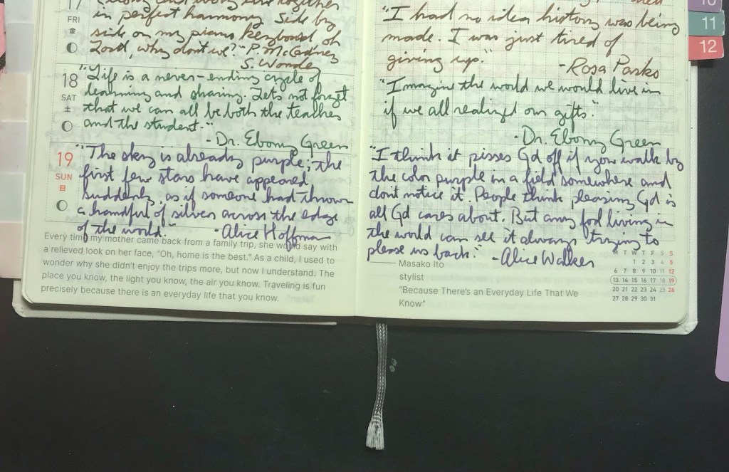 “The sky is already purple; the first few stars have appeared suddenly, as if someone had thrown a handful of silver across the edge of the world.” -Alice Hoffman. “I think it pisses Gd off if you walk by the color purple in a field somewhere and don’t notice it. People think pleasing Gd is all Gd cares about. But any fool living in the world ca. see it always trying to please us back.” -Alice Walker