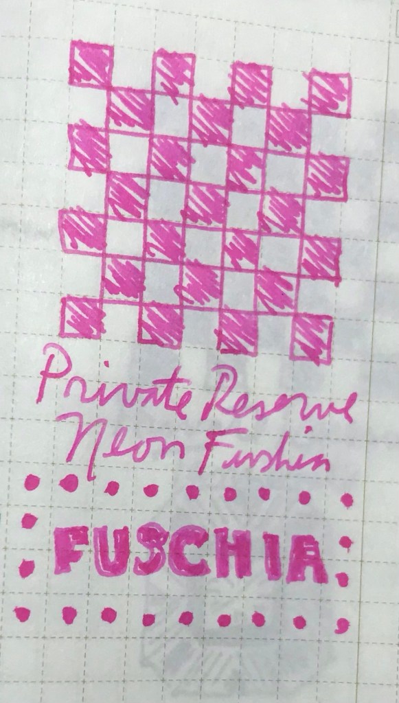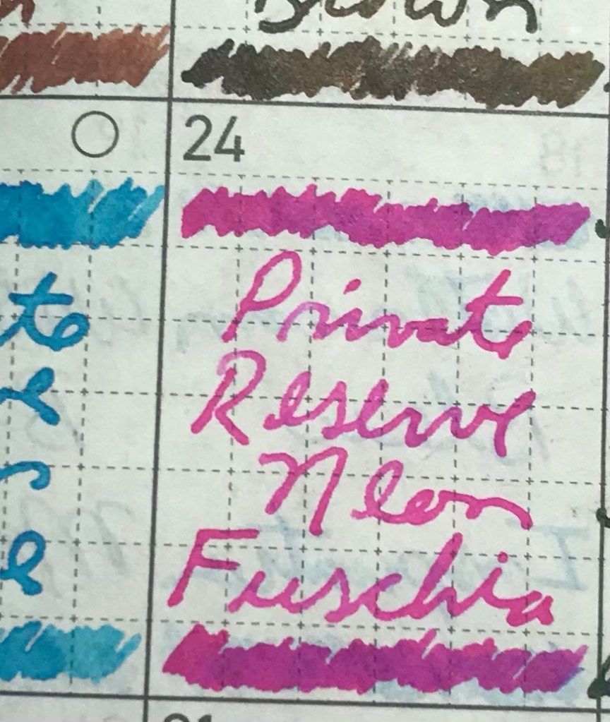 Again, today’s ink stands out in a way other May inks don’t, and yet I don’t totally get a neon vibe (though perhaps today’s is more neon-y than yesterday’s). More importantly, I don’t get a fuschia vibe. But it’s a very, very nice pink, even a “neon pink”.