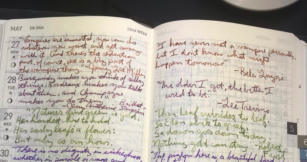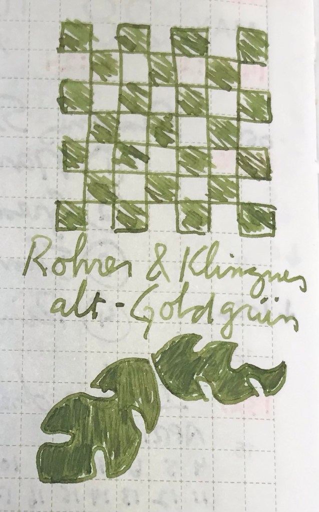 Green-gold isn’t my favorite color, so I’m not terribly objective on this one, but for a color family I don’t care for, it’s certainly a well-behaved, nicely delicate-looking ink. I guess it just reminds me of macrame and old afghans knit by grandmothers. And that’s not a bad thing, I just don’t necessarily look for that in ink I’m likely to use.