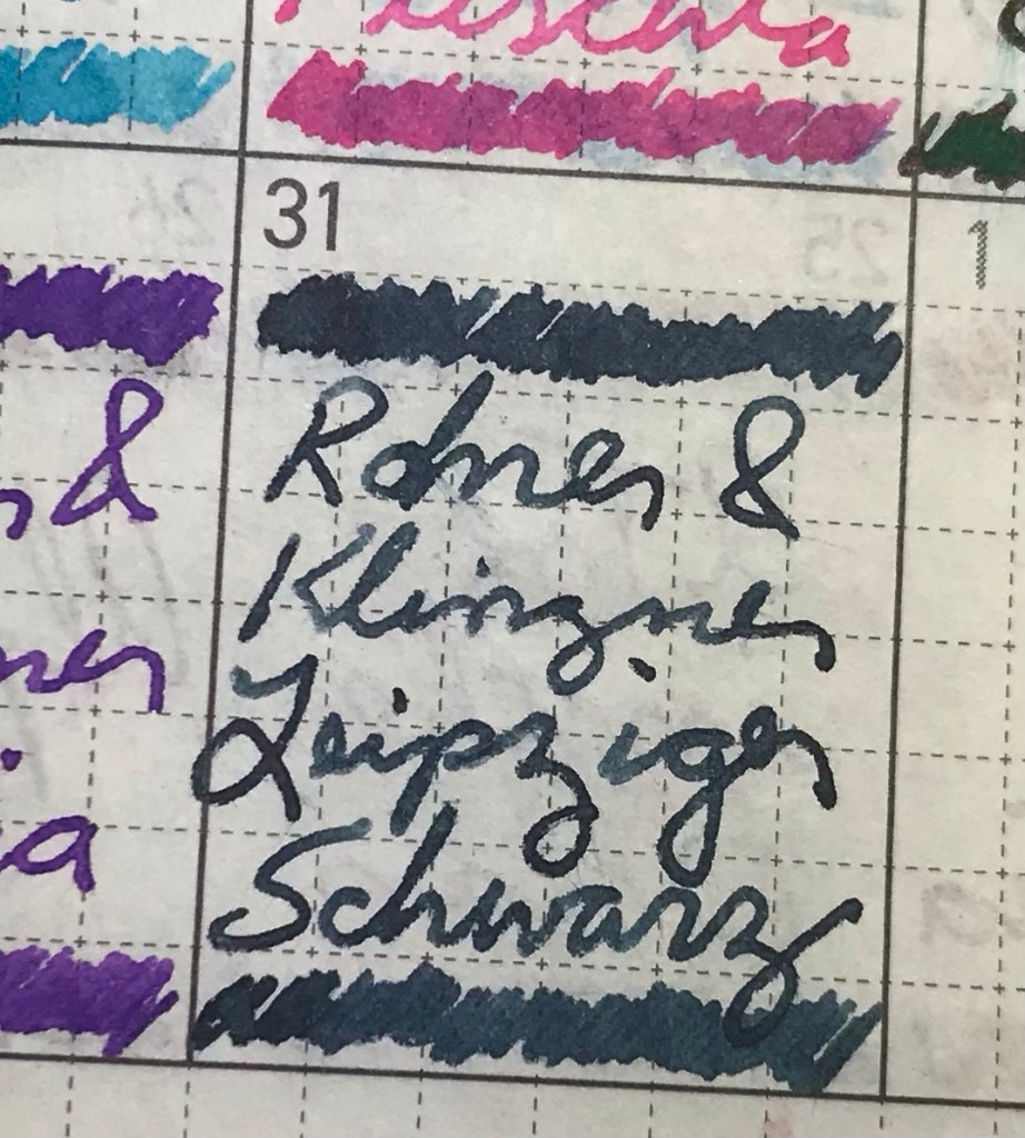 To me this is a greenish black, but it’s definitely one of these “office appropriate” fountain pen inks. Mid-saturation and a mid- kind of feeling to the hue itself, which produces a “soft black” look.