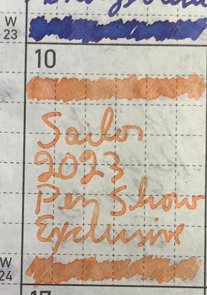 Sailor has some odd naming conventions. They have an entire line where the ink names are three digit numbers. And there basically is no name for this ink; it’s the one that was available at 2023 pen shows in limited quantity,. It’s a pleasant enough pinkish-orange, and for the only Sailor ink I own, I like it!