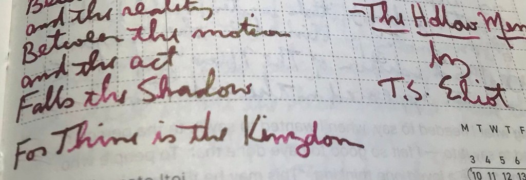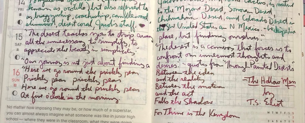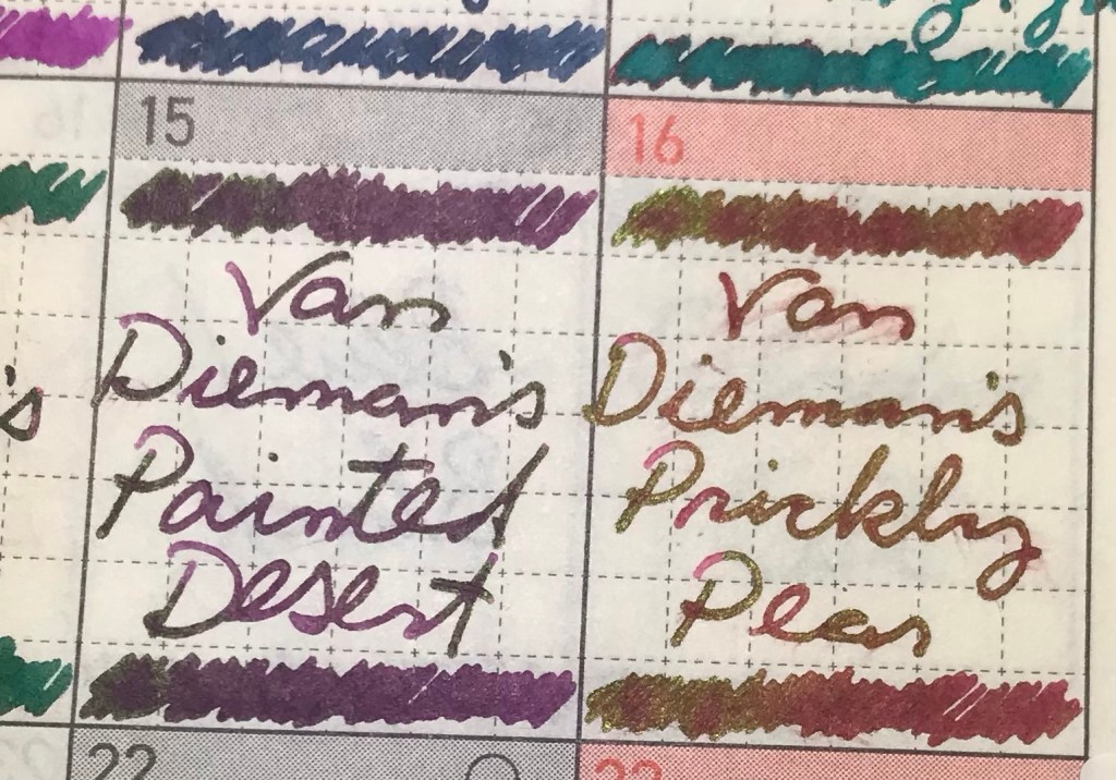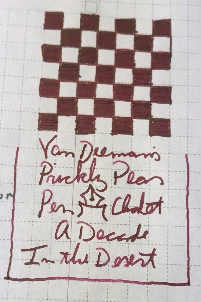 Van Dieman’s Prickly PearPinks and blues and greens all emerge subtly from this ink“Here we go round the prickly pear – Prickly pear prickly pear – Here we go round the prickly pear – At five o’clock in the morning. – Between the idea – and the reality – Between the notion – and the act – Falls the Shadow – For Thine is the Kingdom.” – The Hollow Man by T.S. Eliot