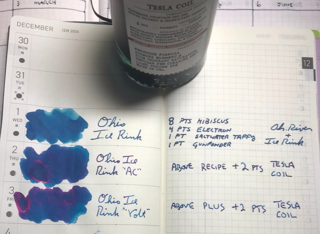 There are roughly 20 Keystone inks in my collection (I think I’m missing one or two that have been sold out), and from the Keystone Formula Inks on the Birmingham website, you can discover recipes for about 144 named inks made with varying amounts of Keystone inks. So Ohio River is a Birmingham color whose recipe calls for 8 parts Hibiscus and 1 part Gunpowder, while Ice Rink calls for 4 parts Electron and 1 part Saltwater Taffy. Combine those together for the ink I called “Ohio Ice Rink” and were off to the races. I like the idea of adding Tesla Coil and simply appending “AC” to the ink name, and another burst of Tesla Coil resulting in the “Volt” variety. As for how far the Inkistry can be pushed before it’s just “mud”, well… that’s what we’re gonna find out this year!