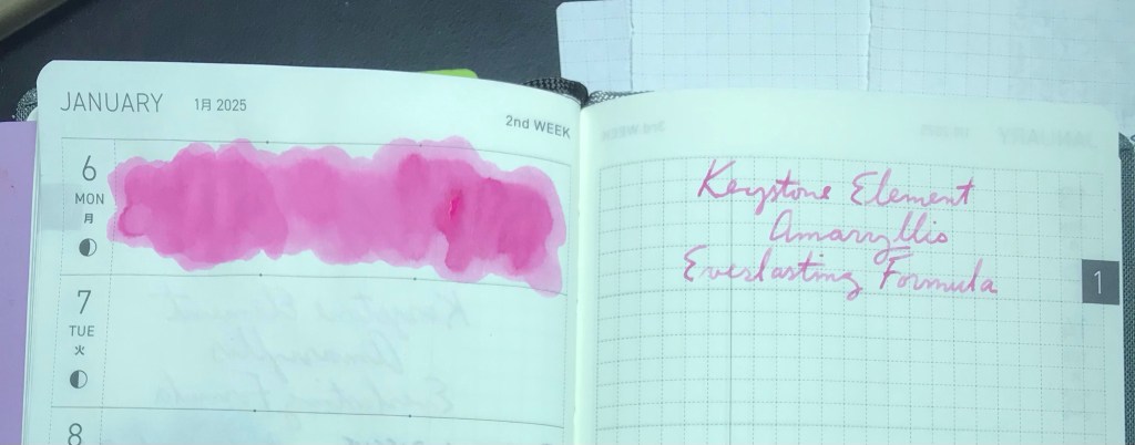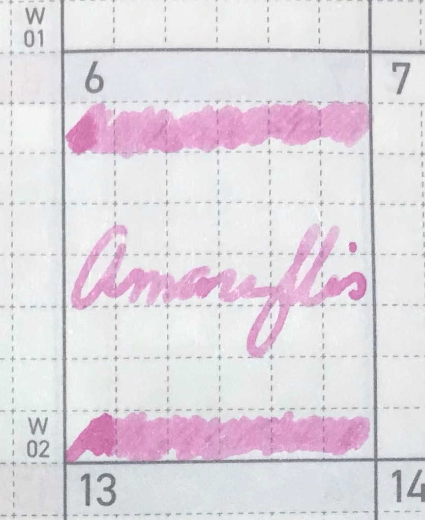 Meet Amaryllis! Despite the delicate-looking color, she’s no pushover, as this is a pigmented ink (unlike the dye-based inks used so far). In addition to being in the Keystone lineup, this ink is also part of Birmingham’s “Everlasting Formula”, meaning it’s water-resistant. I like it!