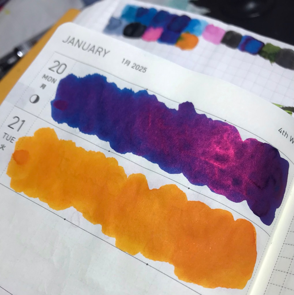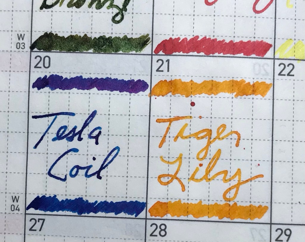 It’s time for Tiger Lily! There are only two more to go (in my collection, anyway): Waterwheel and the newly-arrived Fire Hydrant. I do not have Snapdragon or Yorkshire Canary, not do I have the Dilution Solution or Twinkle Sprinkler, two “elixirs” that are part of the collection. As I mentioned, Birmingham Pen Company is just two brothers who drink coffee and make fountain pens and ink.