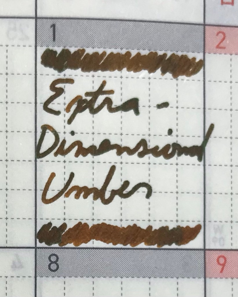 Febraruy will focus on playing with the red Atomink Elements (Amaryllis, Ladybug, Salt Water Taffy, Teaberry Ice Cream, and Fire Hydrant). But Birmingham Pen Company have released a new Atomink Element, and it arrived today. Extradimensional Umber had a lot of green sheen going down, but it subsided as it dried. so I’m most tempted to call this a dual shader. Interesting stuff.