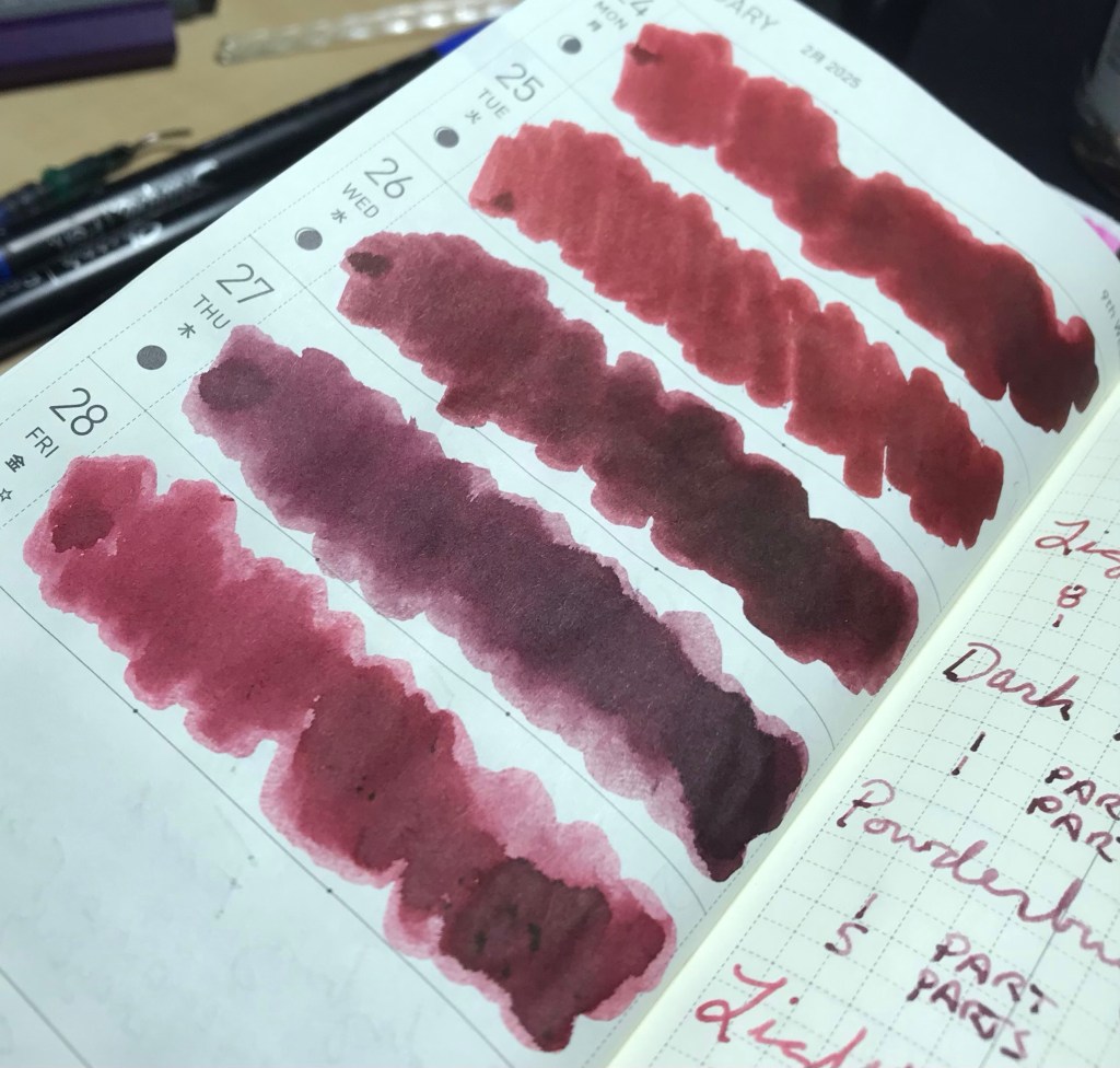There’s something very appealing about the 8:1 ratio of these two inks (and there’s a marked difference, unlike the results of the Fire Hydrant/Gunpowder experiment). It’s got a brightness to the hue, and almost a dual-shading property between two ends of what these two inks produced.